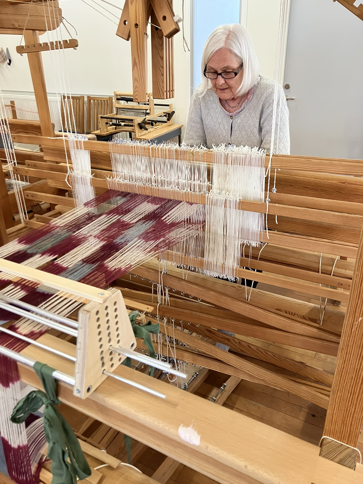 Vå ateljé är något av ett centrum för handvävning. Hit kommer vävintresserade från både när och fjärran till inspirerande möten och kurser. Vi har varit lyckligt lottade då så många donationer kommit vår väg. Den senaste vävstolen som sökte nytt hem hos oss var en Öxabäck Kontramarsch, 135 cm med 10 skaft och trampor. Stort tack till Gunborg Andersson med familj.